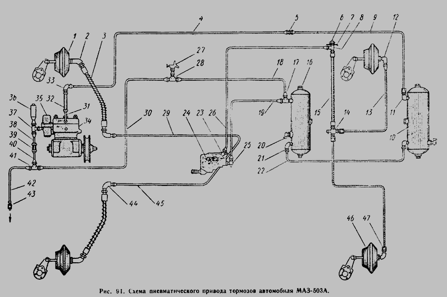 Схема пневматического привода тормозов автомобиля МАЗ-503А » Управление рулевое