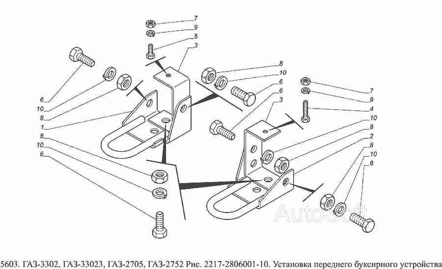 2217-2806001-10 Установка переднего буксирного устройства » Рама, бамперы и брызговики двигателя