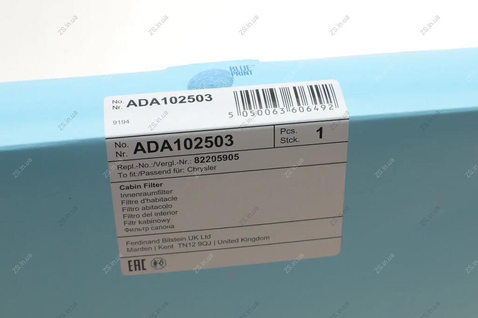 Фільтр салона Chrysler Blue Print ADA102503