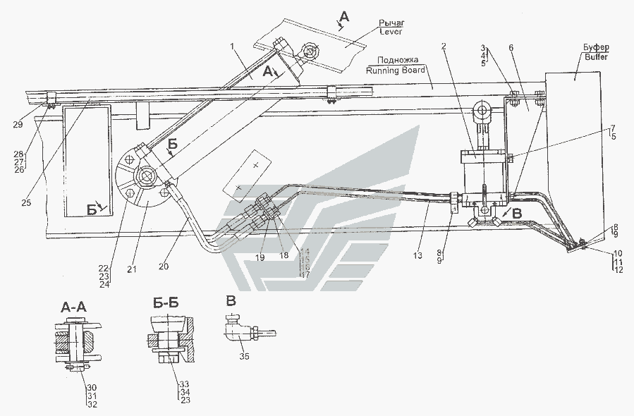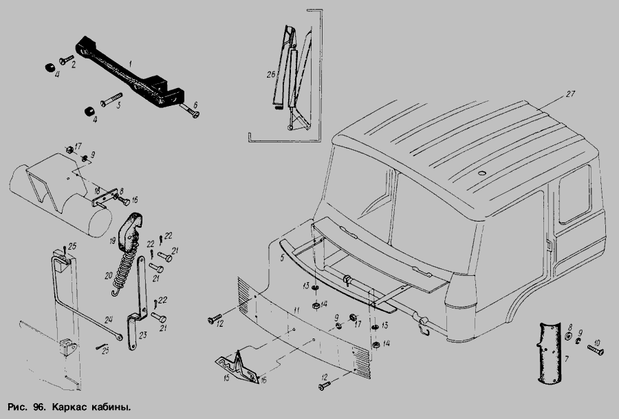 Механізм перекидання кабіни, його циліндр та насос. Привід насоса перекидаючого механізму. Трубопроводи. » Кузов