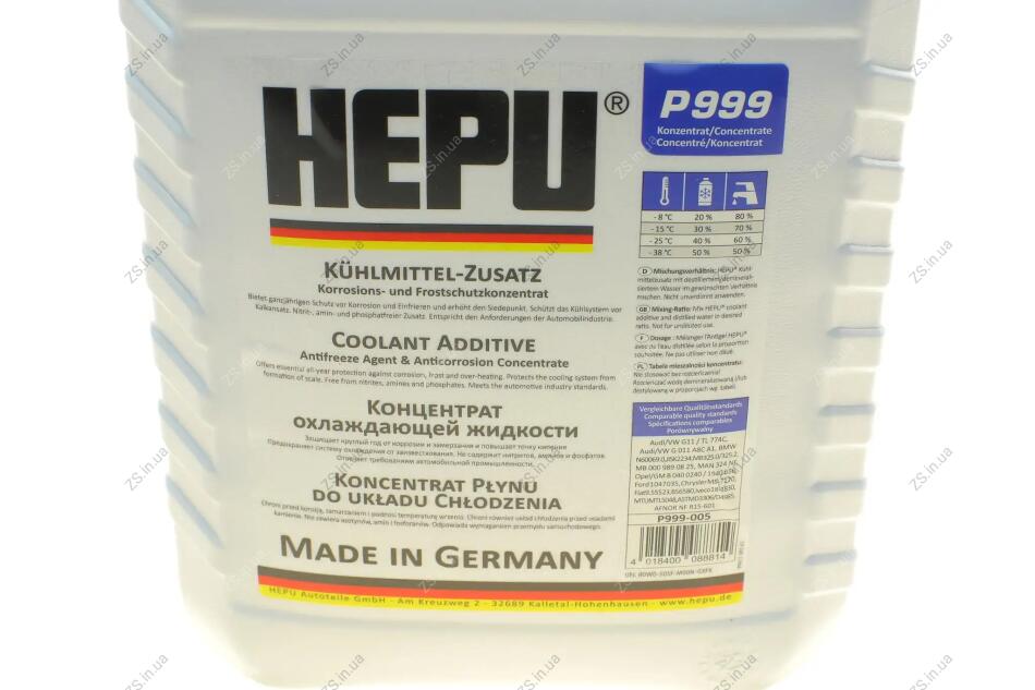 Концентрована рідина, що охолоджує, для універсального застосування. Забезпечує захист від корозії, замерзання та перегріву, а також захищає систему охолодження від утворення накипу. Використовується для двигунів з алюмінію та чавуну. Не містить нітридів, амінів та фосфатів. Колір синій. - Ауді/VW G11 - TL 774A - Ауді/VW G 011 A8C A1 - MB 325.0/325.2 - MB 000 989 08 25 - Opel 1940 656 - Форд 1 047 035 - BS 6520 UNE 26-361 - AFNOR NF R15-601 Суміш °C / P999 / Вода - 15 °C / 30% / 70% - 25 °C / 40% / 60% - 38 °C / 50% / 50%