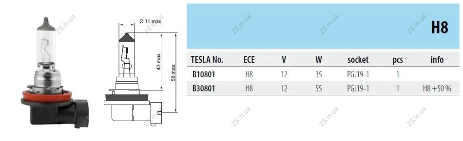 TS Лампа (H8, 12V, 35 W, PGJ 19-1)+50% TESLA B 30801
